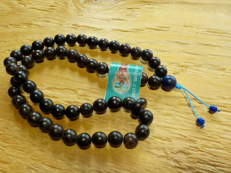 Palm Nut (aka "Bodhi Root) with rosewood disc between 54s and lapis guru bead with lapis tassel beads.
