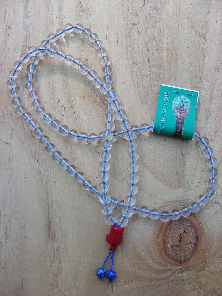 Crystal custom mala with bamboo coral guru bead and lapis lazuli tassel beads.