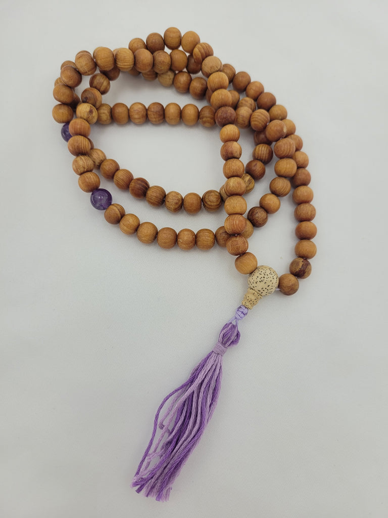 Devadaru with amethyst at first 27s, Chinese lotus guru bead and cone with tassel.