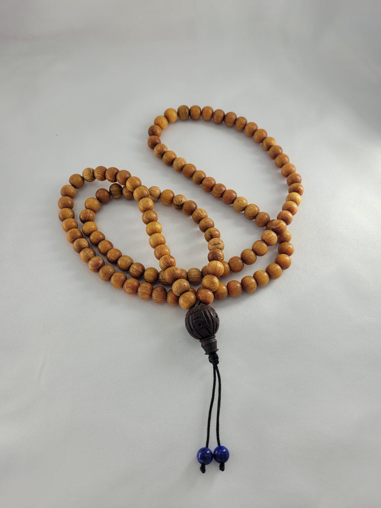 Devadaru mala with Rosewood engraved OM MANI PADME HUNG and lapis lazuli tassel beads.