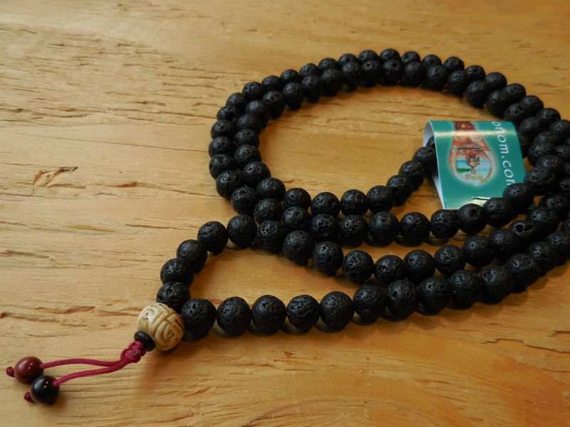 Lava Rock with yak bone engraved om mani padme hung, agate tassle beads.