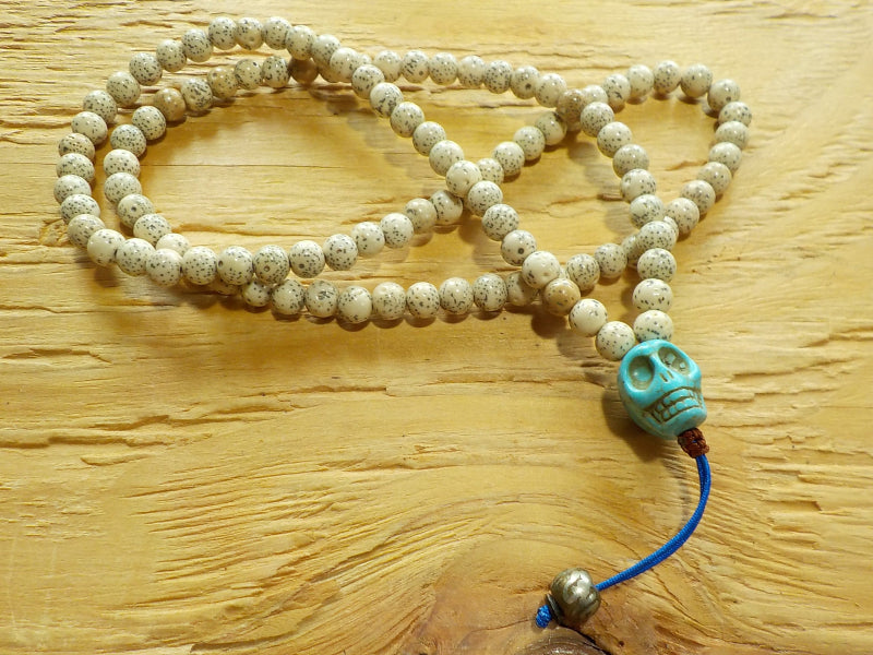 Chinese lotus seed mala with skull and copper inlay bead reading "Om Mani Padme Hung"