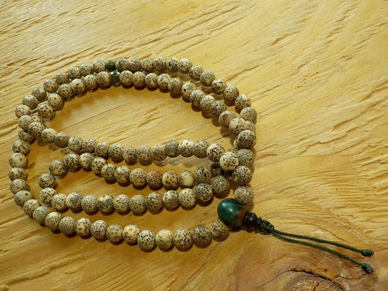 Chinese lotus seed mala with faceted jade at first 27s, yak bone guru bead and rosewood cone.