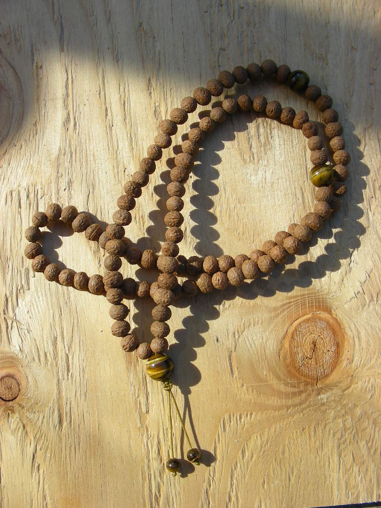 Plum seed with tiger eye at first 27s, guru and tassel beads.