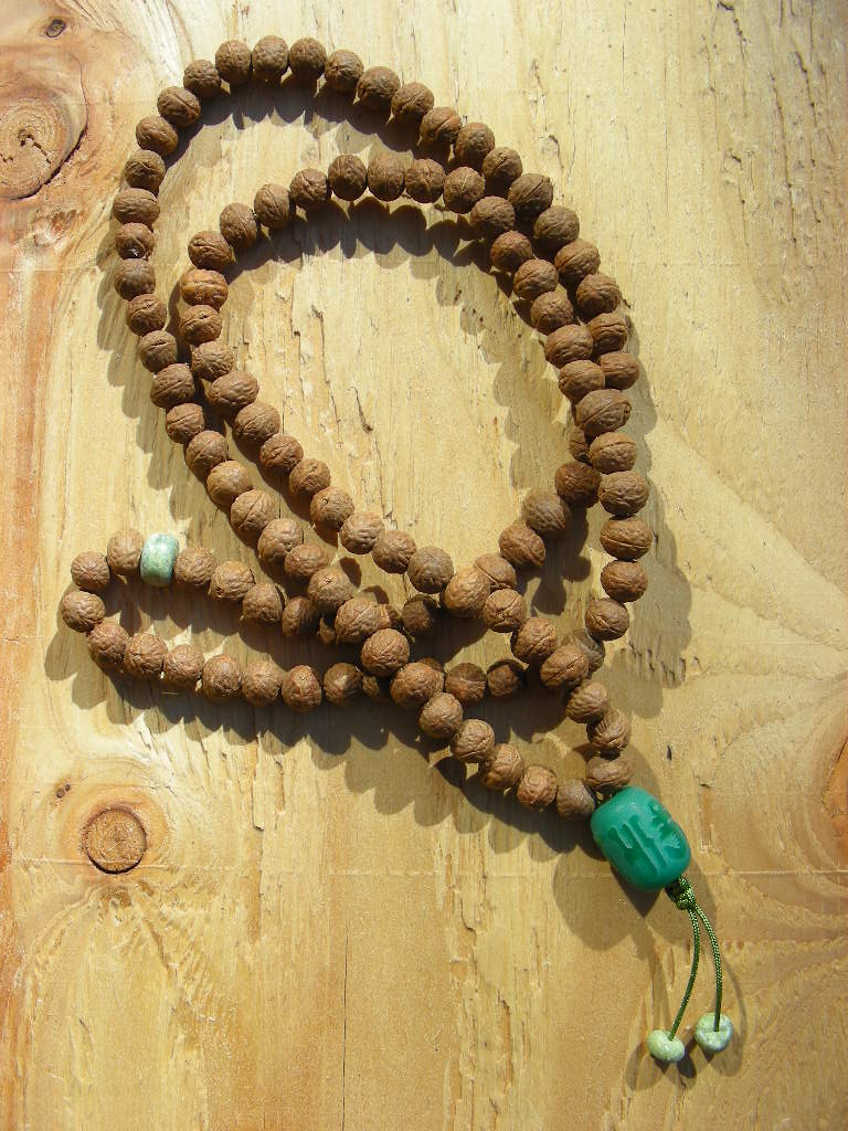 Plum seed with serpentine disc dividing 54s and as tassel beads; om mani padme hung guru bead.