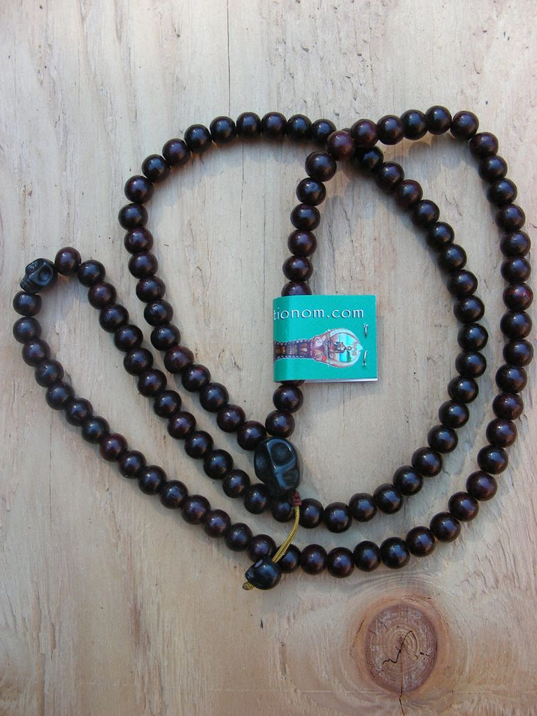 Rosewood with agate skulls dividing 54s, as guru bead and tassel bead.