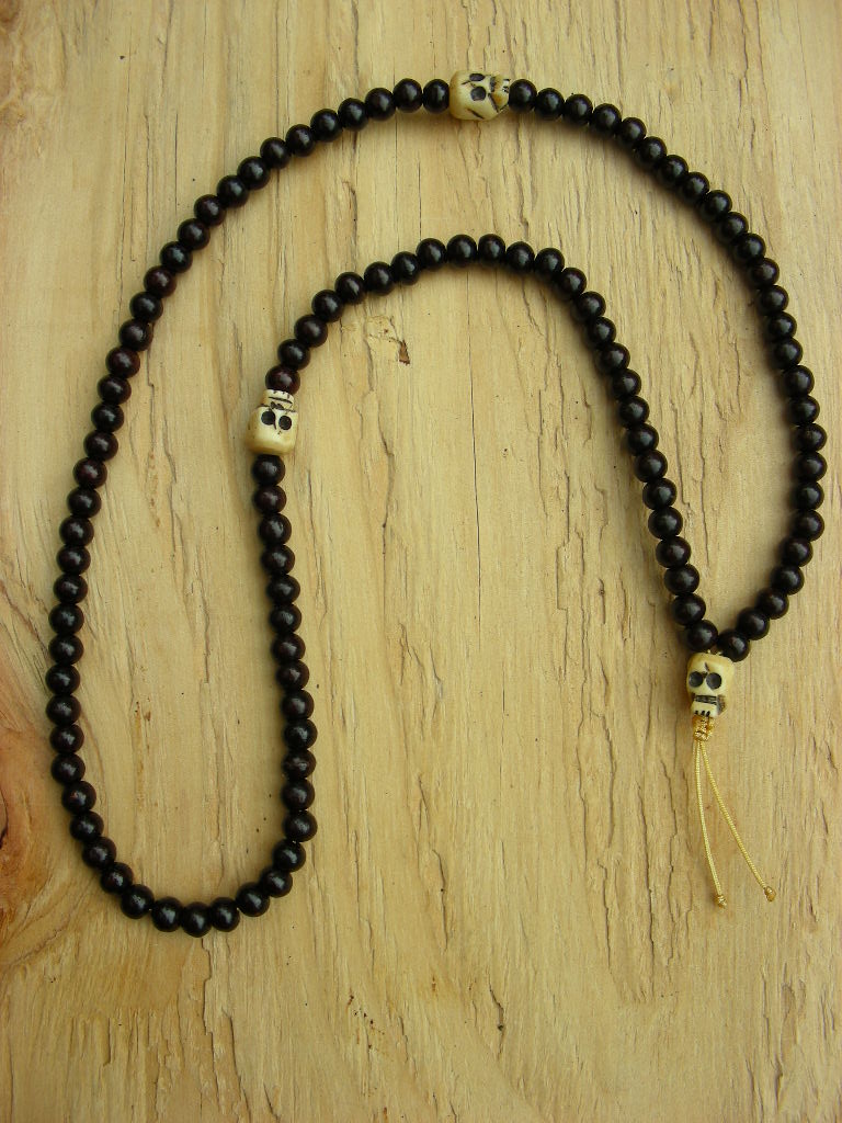 Rosewood with yak bone skull beads at first 27s and guru bead.