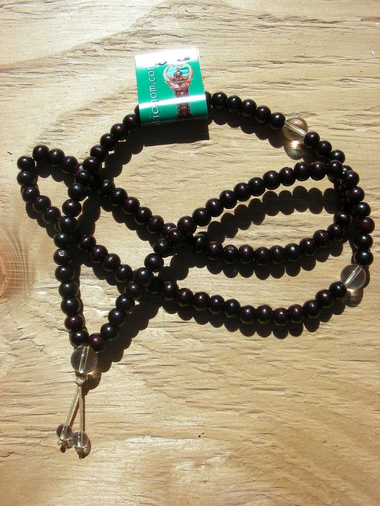 Rosewood with crystal markers at first 27s, guru bead and tassels.