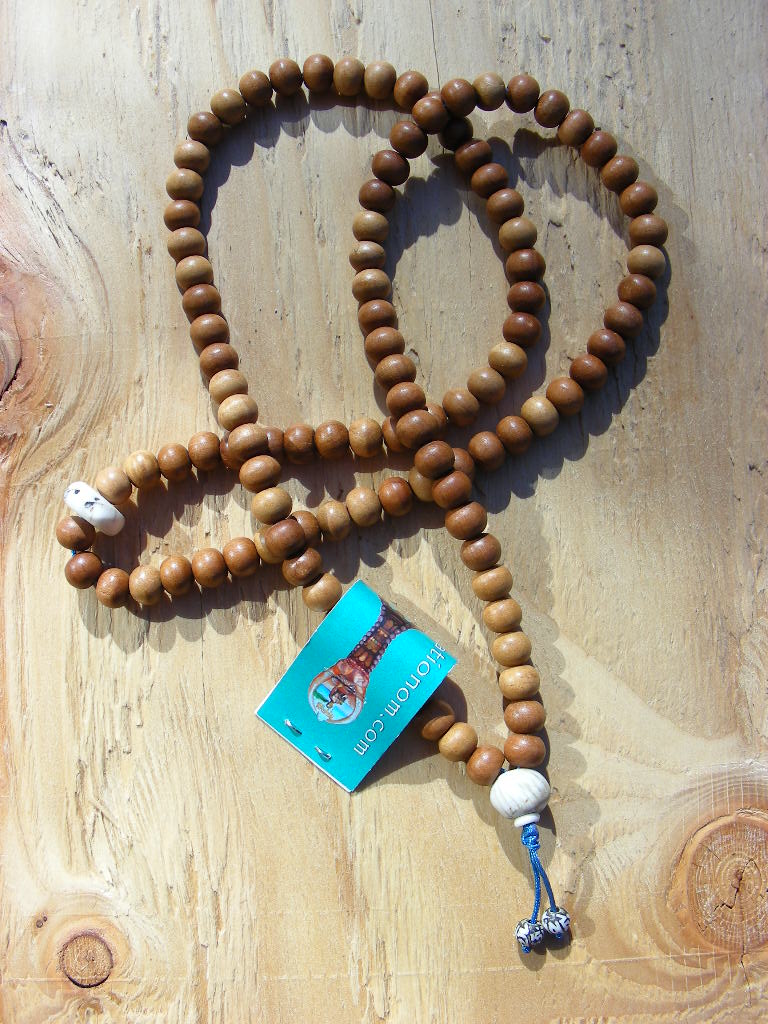 Sandalwood with conch divider at 54s, conch guru bead with om mani padme hung tassel beads.