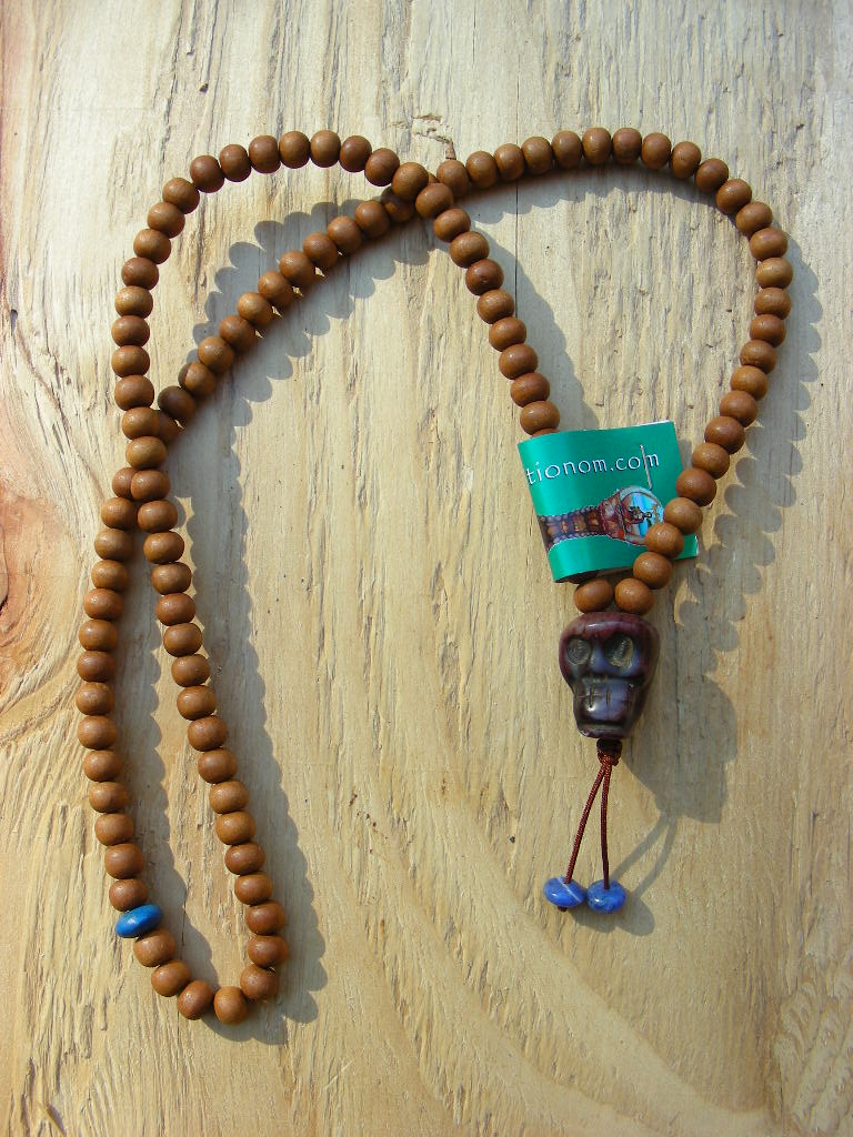 Sandalwood with lapis disc dividing 54s and as tassel beads; Nepali jasper skull guru bead.