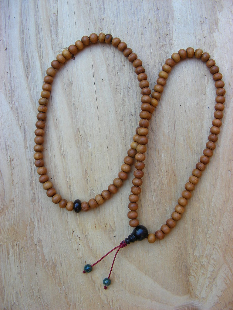 Sandalwood with rosewood disc dividing 54s and guru bead; moonstone tassel beads.