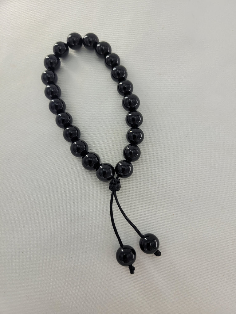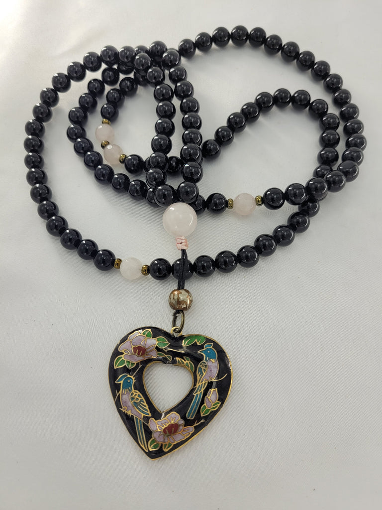 8mm mala - 108 beads - 34" around. Onyx mala with rose quartz at 27s and as guru bead, metal spacers on either sides of rose quartz. OM MANI PADME HUNG copper bead with metal inlay atop ceramic heart.