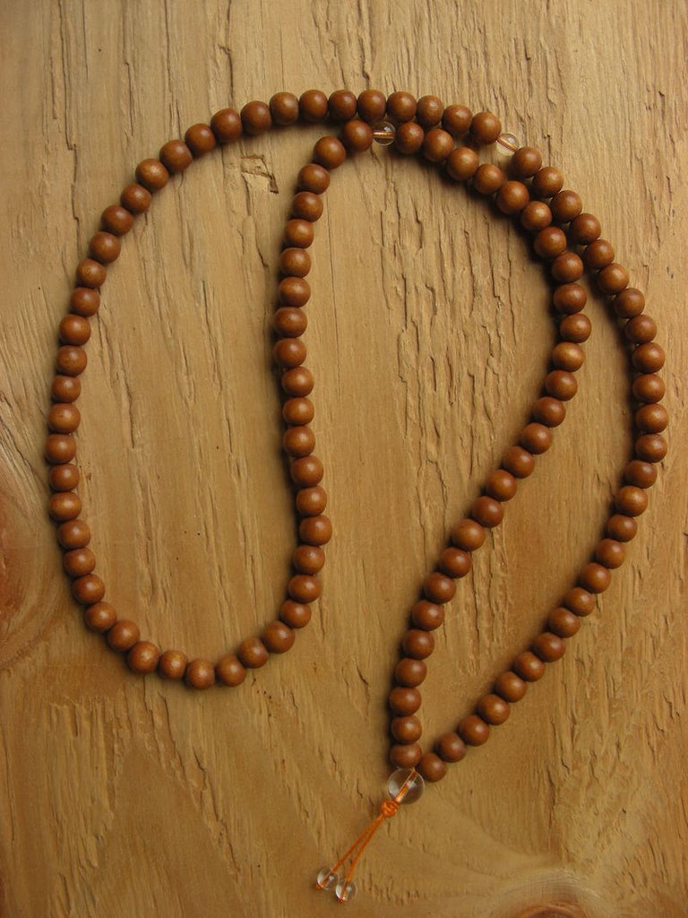 Orangewood mala with crystal at first 27s, guru bead and tassel beads.